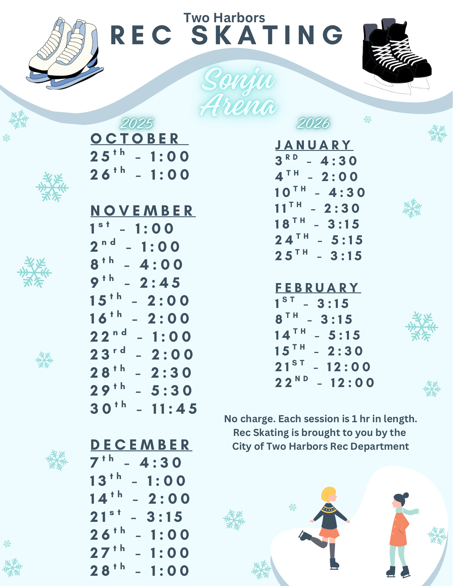Rec Skating is a free program sponsored by the City of Two Harbors Rec Department